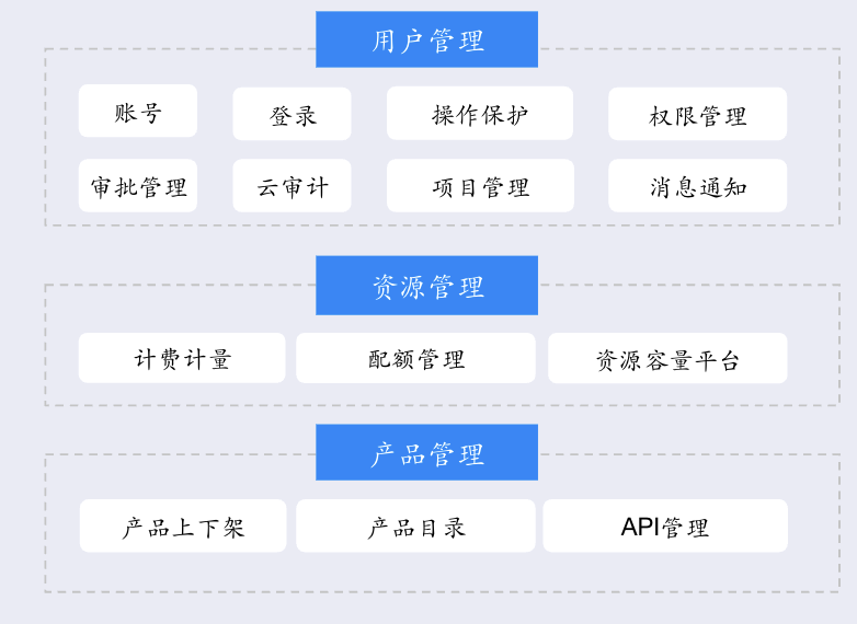 基础平台和运营平台(基础版)主要提供用户管理、资源管理、产品管理的能力,具体功能架构如下。