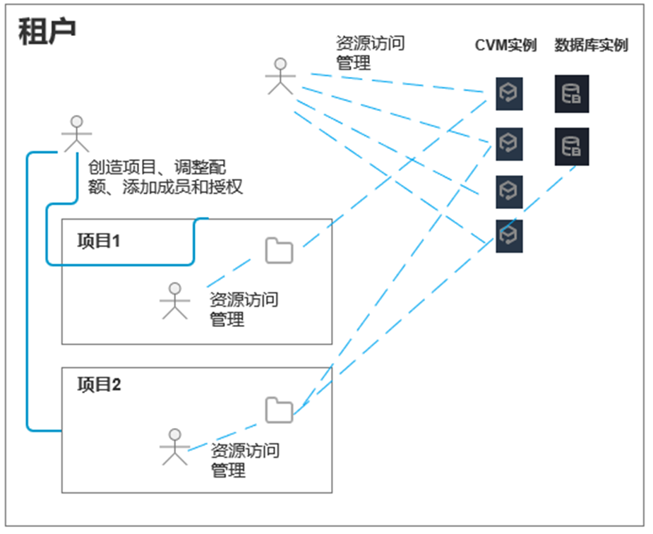 平台提供了租户内资源分组管理的功能。项目是一个虚拟组织,包括资源、配额、人员和权限3个主要属性。