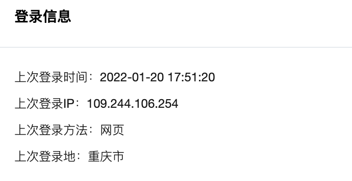 登录后,总览页可显示上次的登录时间、IP、方法和登录地区。