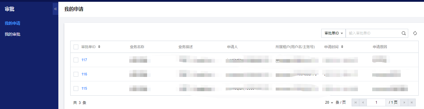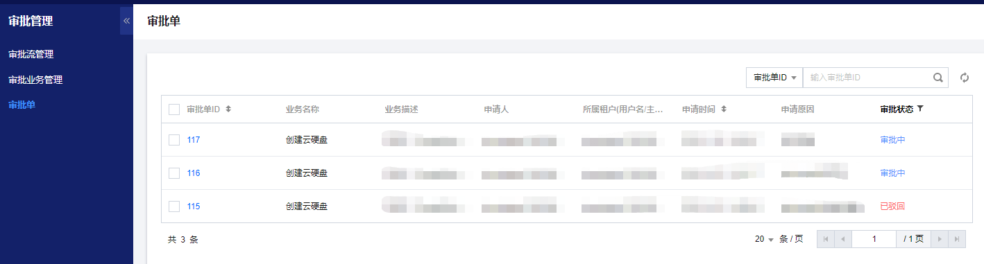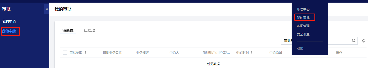 若给子用户关联审批管理全读写权限ApprovalFullAccess,则在审批管理下的审批单菜单下,可查看当前租户的所有审批单。