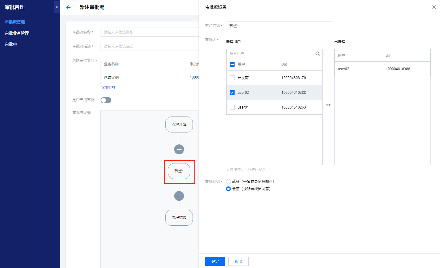 设置审批流 可设置多个审批节点,目前最多支持设置5个审批节点。每个节点可设置多个审批人,审批人列表拉取的是当前租户下的用户列表。 若运营端管理员基于某个业务定义了一个审批流,且审批流的作用范围包括租户A,租户A在租户端也基于该业务定义并开启了审批流,则租户A下的用户在页面触发该业务时,实际的审批流程是将租户A下该业务的审批流和运营端该业务的审批流拼接起来形成一个新的审批流,当租户A在页面触发该业务时,需先由租户A下该业务的审批人审批通过之后,再流转到运营端,由运营端该业务的审批人审批。 举个例子:运营端基于“创建云服务器实例”定义并开启了一个审批流,审批作用范围包含租户A,审批人是运营端的子用户user01;租户A在租户端也基于“创建云服务器实例”定义并开启了一个审批流,审批人是租户A的子用户user02;此时,租户A下的某个子用户在创建云服务器实例时,会生成一个审批单,审批单先流转到租户A的子用户user02名下,若user02驳回该审批单,则整个审批单状态为驳回,云服务器无法被创建出来,若租户A的子用户user02同意该审批单,则单子会被流转到运营端的子用户user01下,若user01同意该单,则整个审批单的状态为通过,此时云服务器实例会被创建出来。