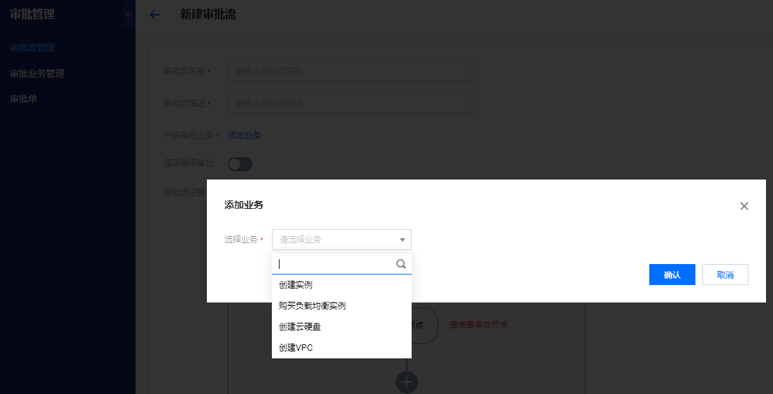 添加业务 选择要审批的业务,当前入口创建的审批流,只对当前租户生效,对其他租户不生效