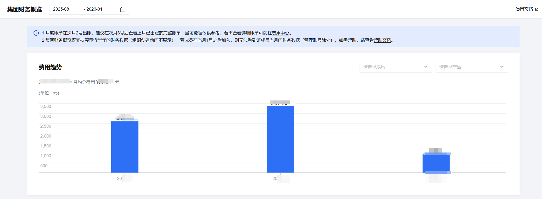 - 在集团财务概览页面最上方选择相应的时间,在费用趋势模块选择成员以及产品,则会对应显示出费用趋势和账单详情。