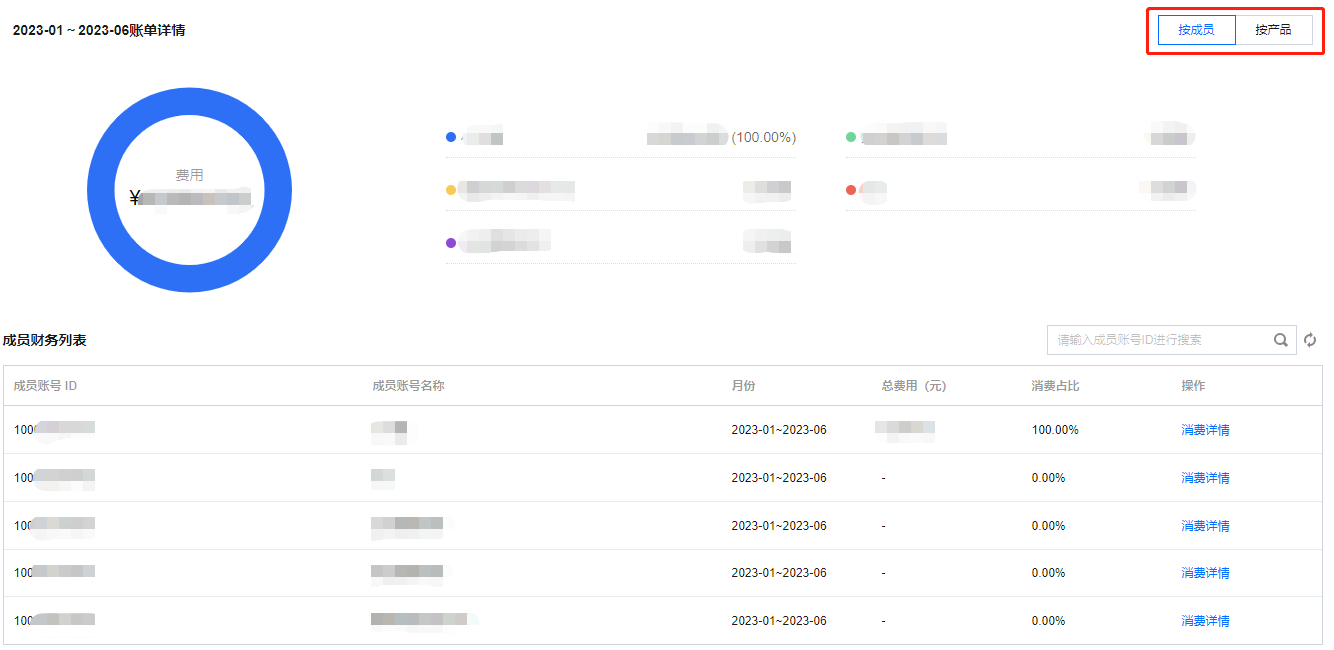 - 在下方展示所选成员的财务列表,包含成员账号 ID、成员账号名称、时间、总费用、消费占比、详情。单击消费详情则会显示某成员在所选时间内的产品消耗分布图。