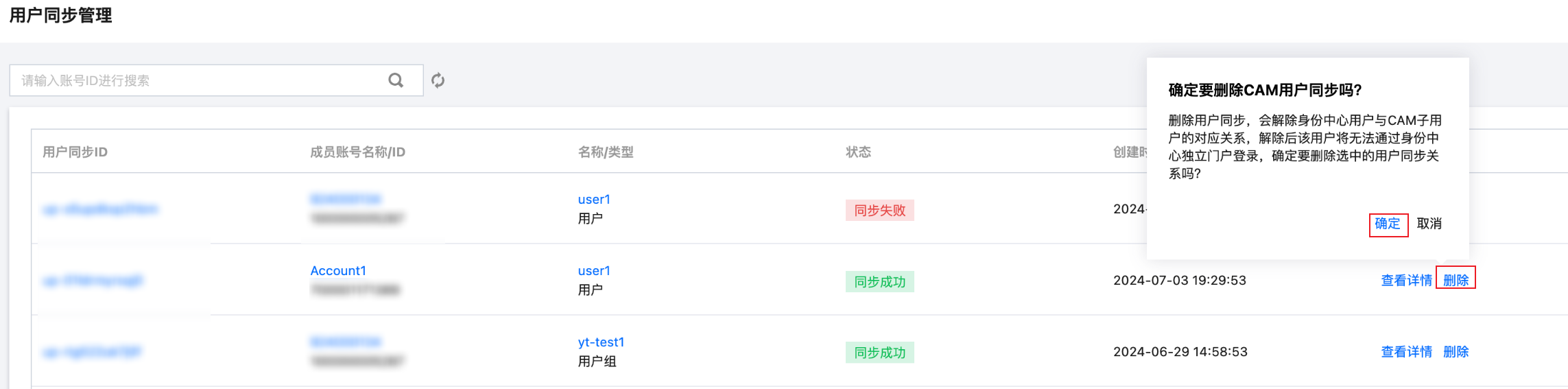 - 在用户同步管理页面,单击目标用户同步操作列的删除。