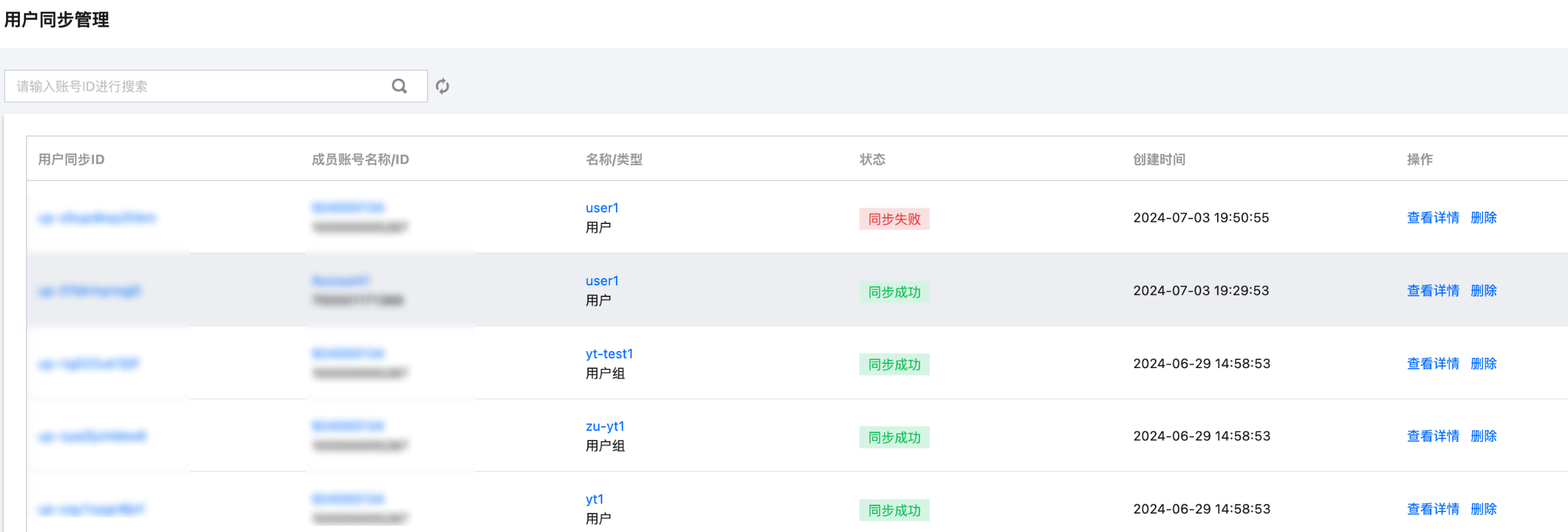 - 在用户同步管理页面,单击目标用户同步操作列的查看详情。