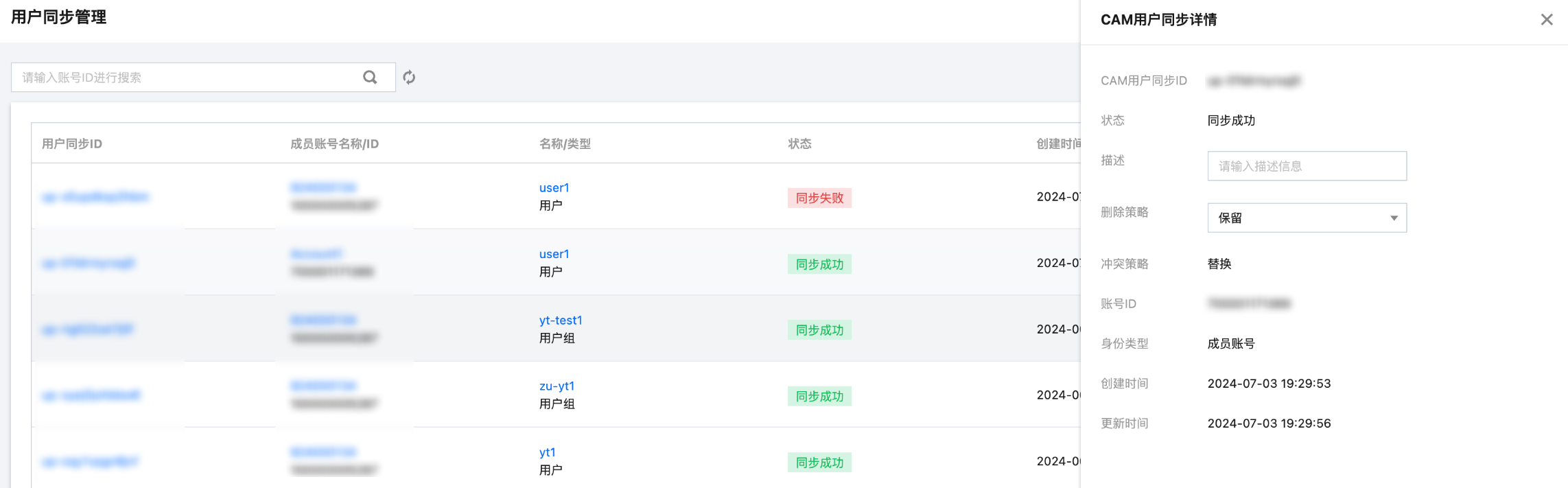 - 在用户同步详情面板,查看用户同步详情。包括 CAM 用户同步 ID、状态、删除策略、冲突策略、创建时间等。