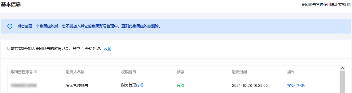 登录集团账号管理控制台,选择左侧导航栏中的集团设置-基本信息,即可在基本信息页面中查看在有效期内的邀请记录,单击接受即可加入组织。如需拒绝加入该集团组织,单击拒绝即可拒绝加入。如下图所示: