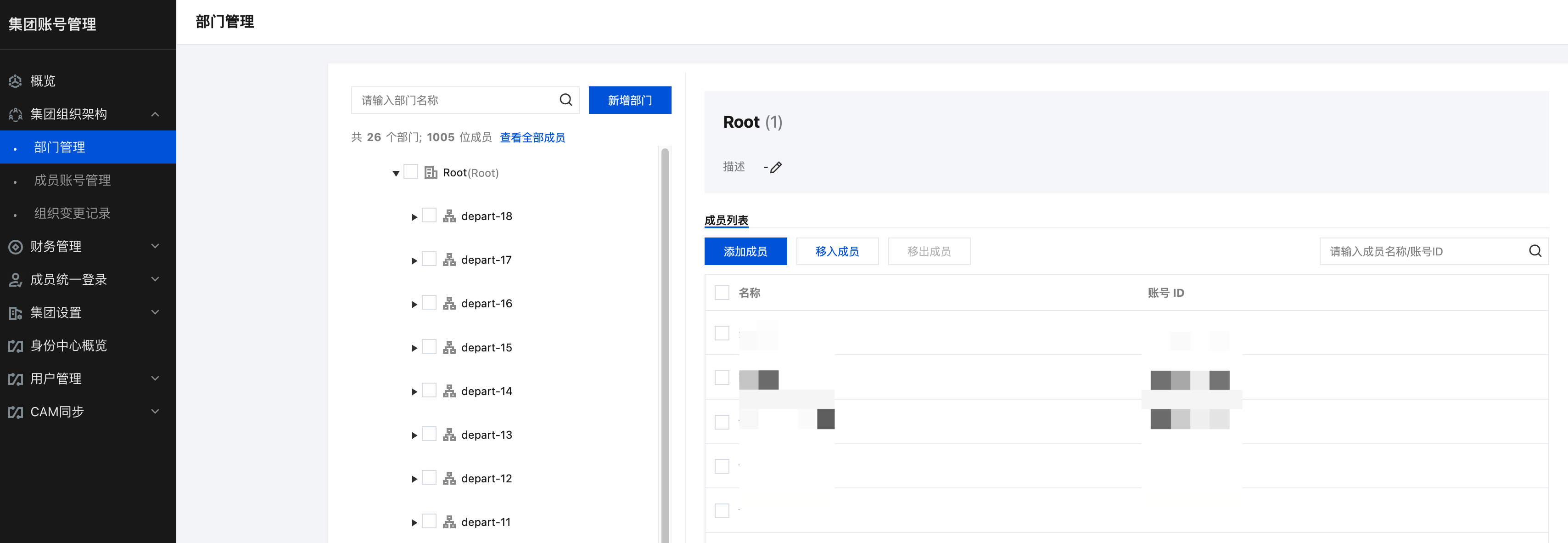集团管理员或者成员,可在集团账号管理中查看组织中的部门信息。