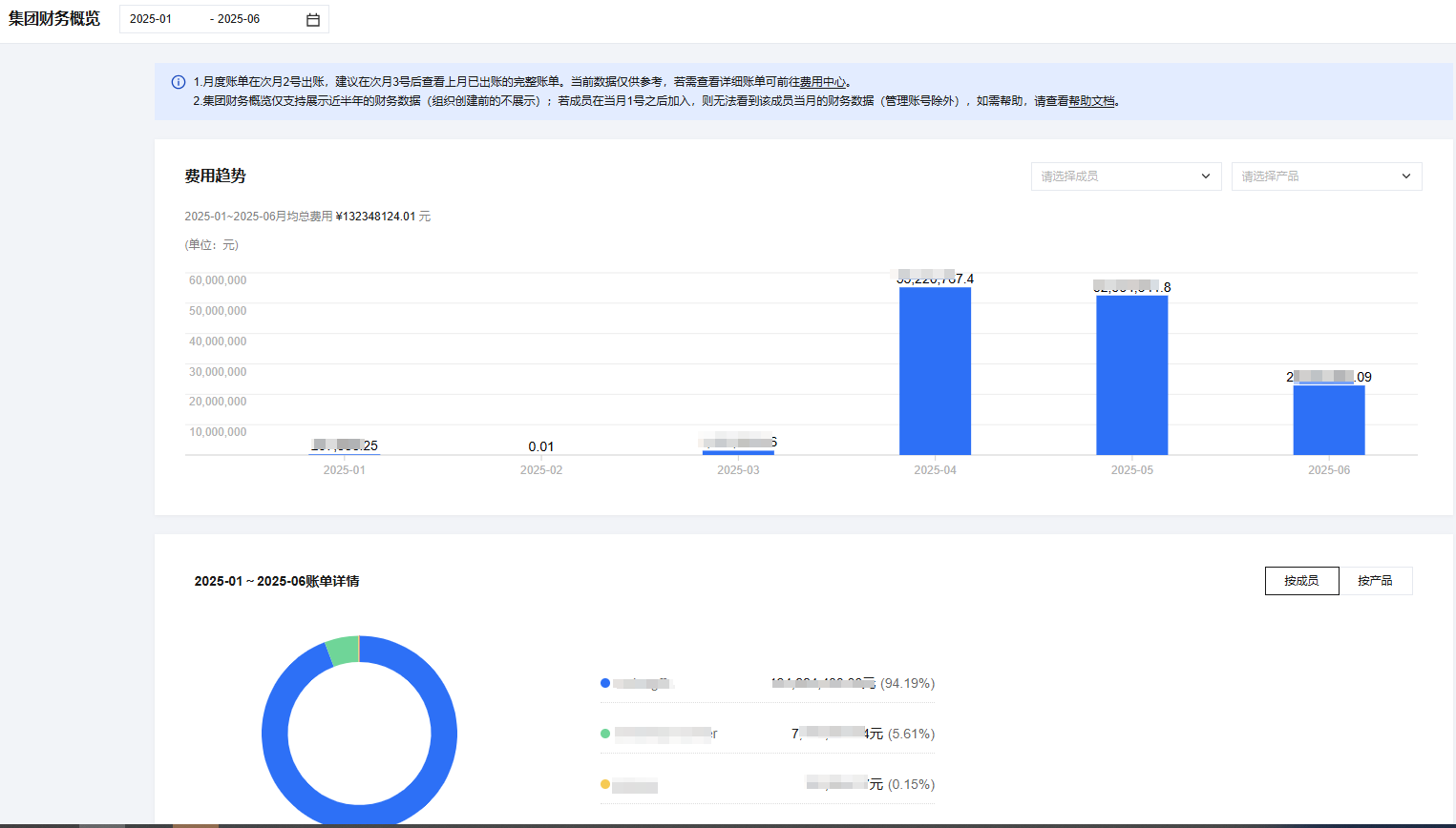 集团财务概览为您提供集团组织中所有账号的历史财务汇总,同时支持按照成员账号、产品等维度聚合查看,如下图所示: