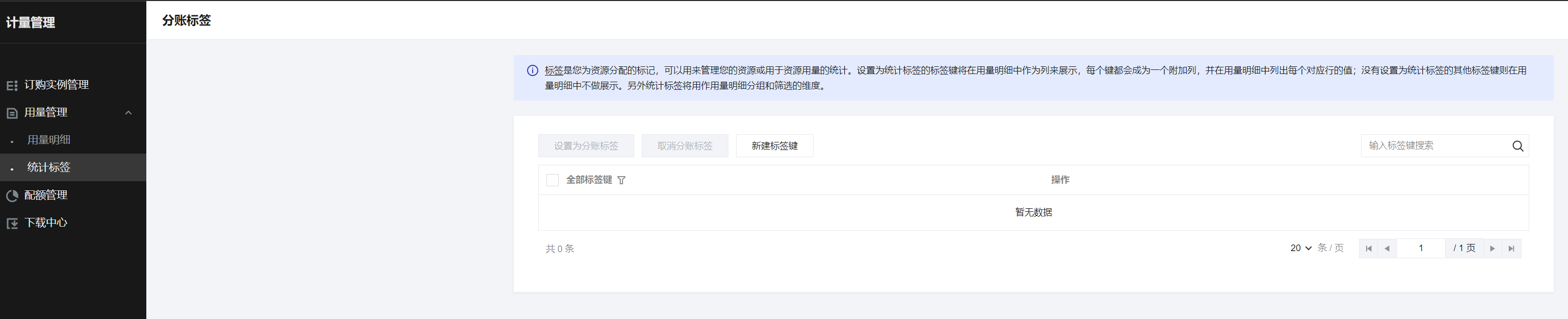 标签是用户为资源分配的标记,可以用来管理用户的资源或用于资源用量的统计。设置为统计标签的标签键将在用量明细中作为列来展示,每个键都会成为一个附加列,并在用量明细中列出每个对应行的值;没有设置为统计标签的其他标签键则在用量明细中不做展示。另外统计标签将用作用量明细分组和筛选的维度。