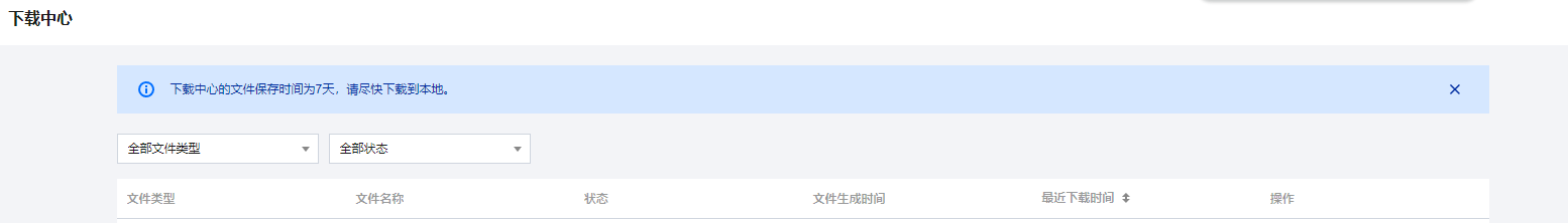 查看下载任务列表,列表包含文件类型、文件名称、状态、生成时间、最近下载时间。