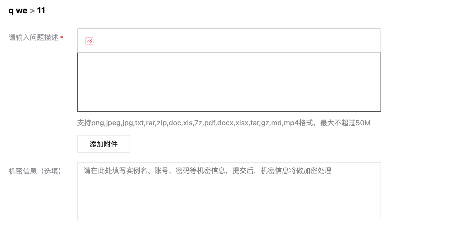 填写问题详情并提交,支持 .pdf/.jpeg/.zip/.docx/.xlsx/.tar/.gz/.md/.7z/.mp4 格式文件,上传文件大小上限50M。