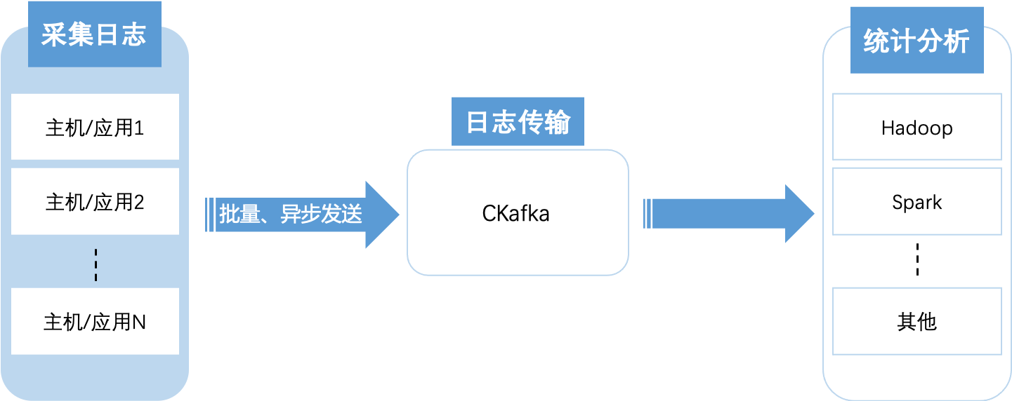 消息队列 CKafka 的特性决定它非常适合作为“日志收集中心”;多台主机/应用可以将操作日志“批量”“异步”地发送到消息队列 CKafka 集群,而无需保存在本地或者 DB 中;消息队列 CKafka 可以批量提交消息/压缩消息,对于生产者而言,几乎感觉不到性能的开支。此时消费者可以使用 Hadoop 等其他系统化的存储和分析系统对拉取日志进行统计分析。