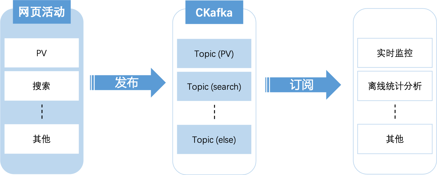 消息队列 CKafka 通过实时处理网站活动(PV、搜索、用户其他活动等),并根据类型发布到 Topic 中,这些信息流可以被用于实时监控或离线统计分析等。