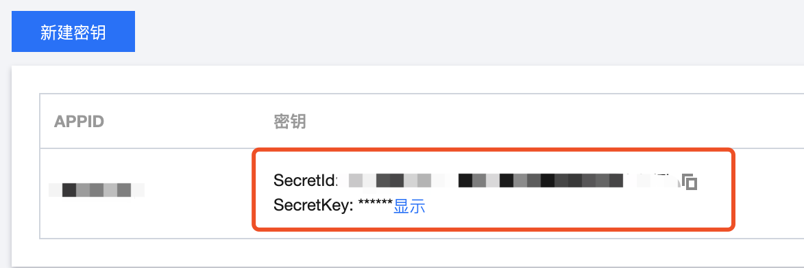 在密钥列表中,可以查看并复制 SecretId 和 SecretKey。您也可以新建密钥信息,详情请参考 【访问密钥】 文档。