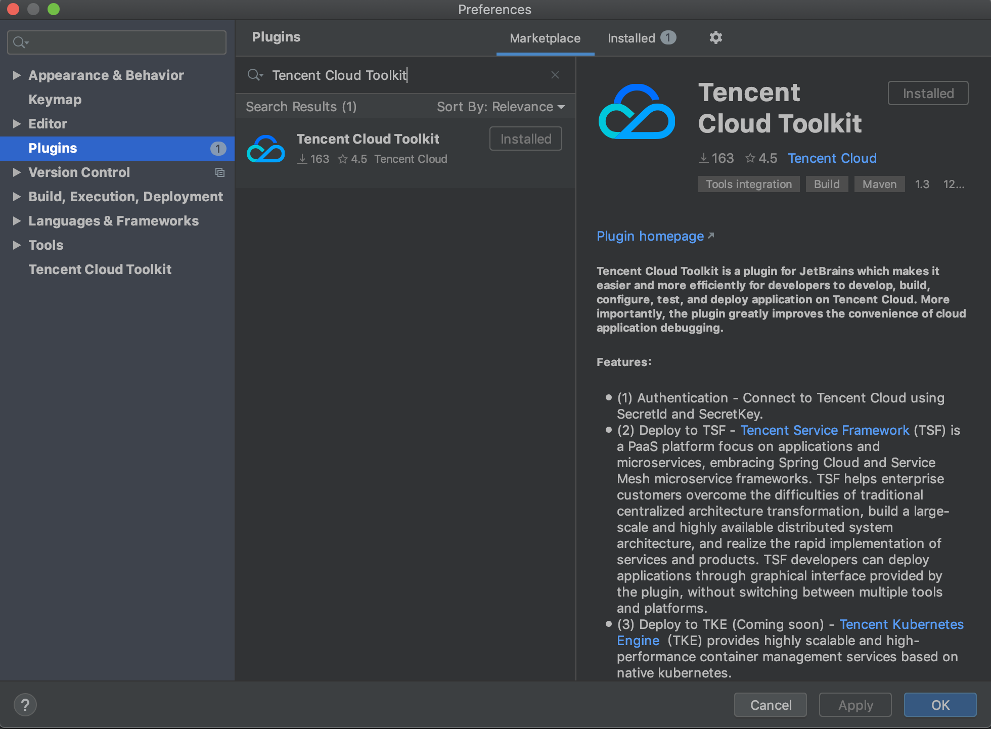 通过本篇文档,您将会了解到如何在 IntelliJ IDEA 中安装和配置 Tencent Cloud Toolkit。安装配置完成后,您可以将本地应用快速部署到微服务平台 TSF(包括虚拟机部署、容器部署),还可以使用 Tencent Cloud Toolkit 编译、上传程序包和镜像。