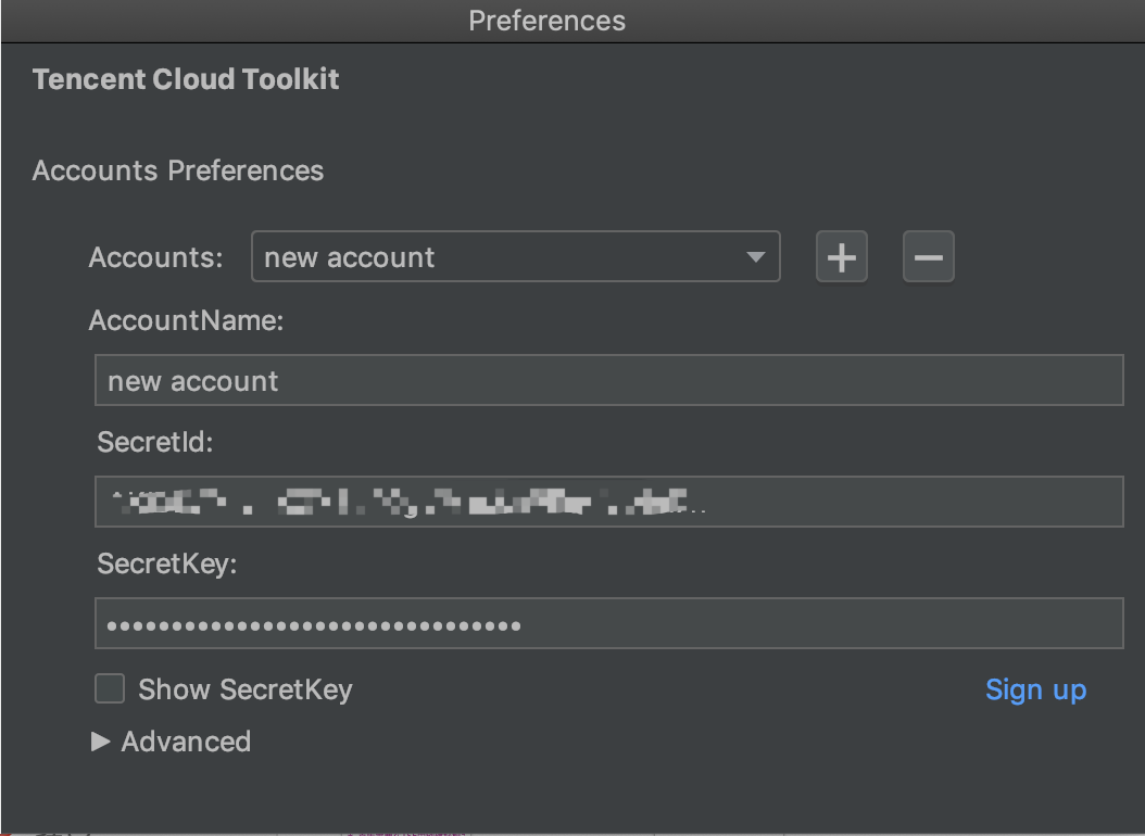 使用 Tencent Toolkit 部署应用到云端时,需要调用 TSF 的 API,调用 API 时需要使用访问密钥(SecretId、SecretKey)进行云端身份验证。因此在部署应用之前,需要先在 Tencent Toolkit 中配置账户信息,操作步骤如下: