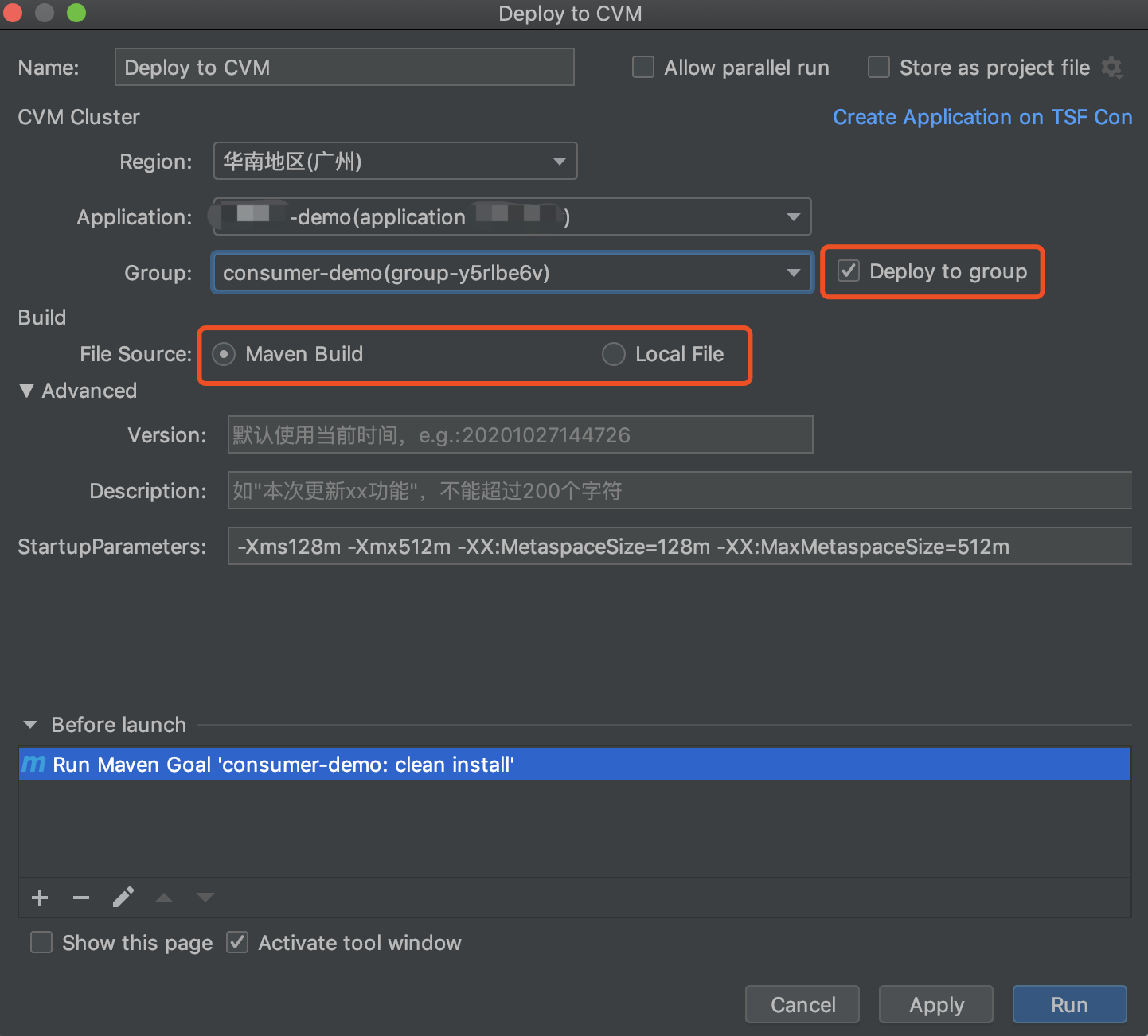 - Deploy to group:是否执行部署,默认执行。如果取消勾选,则仅上传程序包至 TSF 程序包仓库。