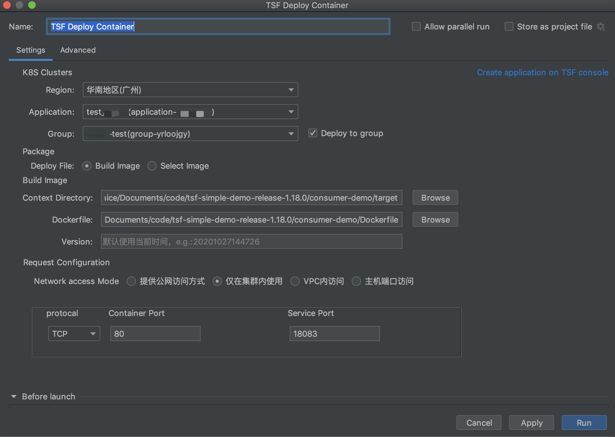 - Deploy to group:是否执行部署,默认执行。如果取消勾选,则仅上传镜像至 TSF 镜像仓库。