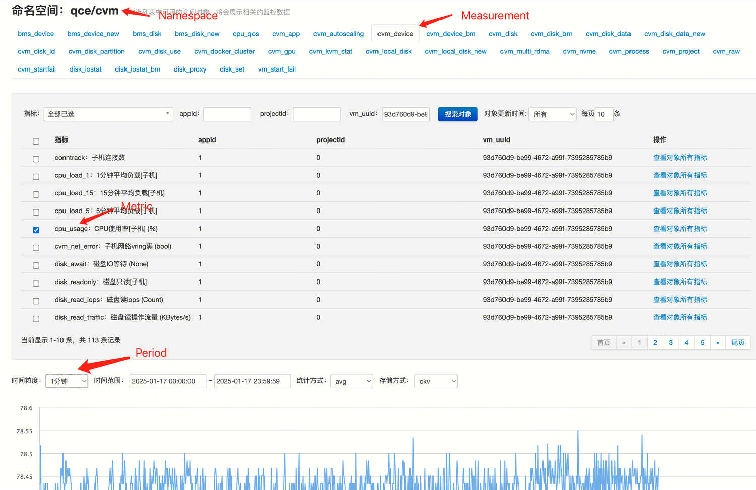 // 如需知道指标所在的Namespace和Measurement及支持的时间粒度,可参考附录