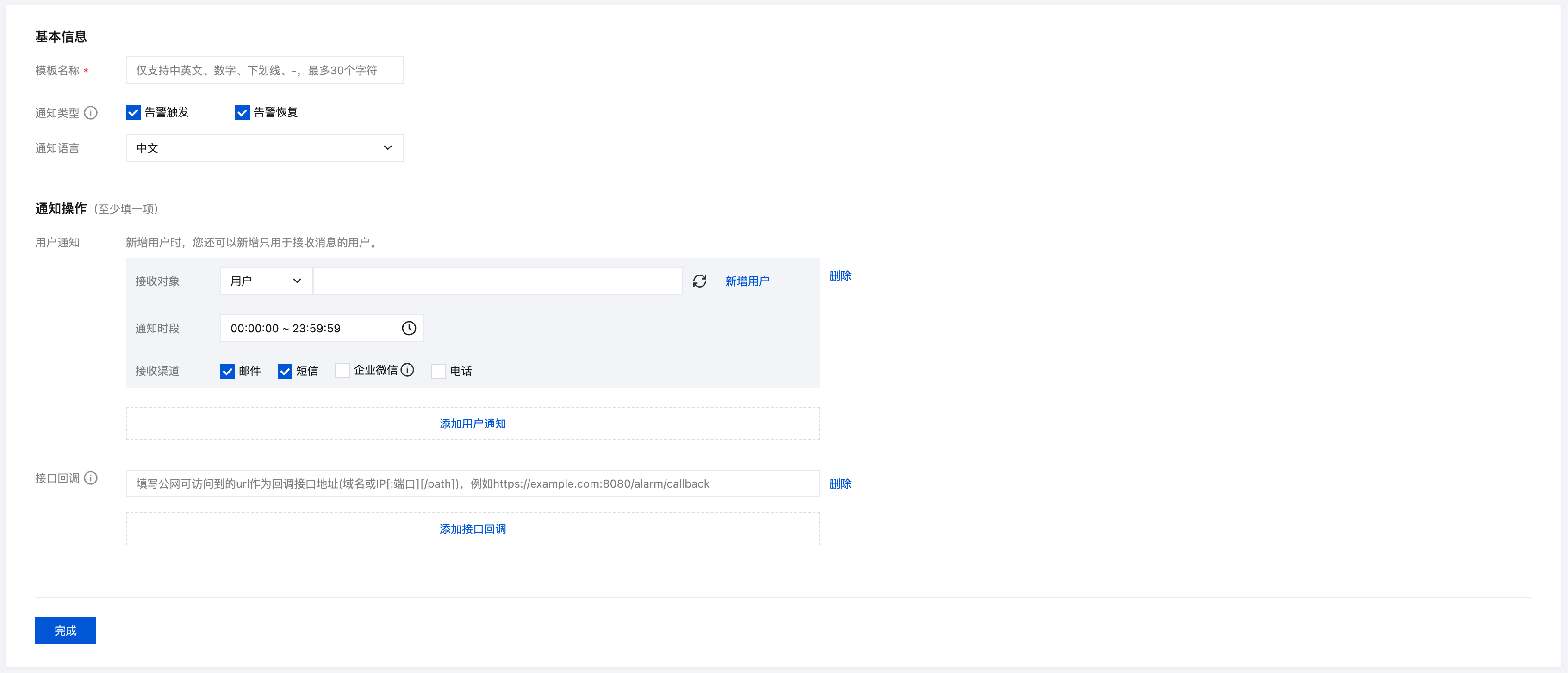 - 接收对象:可选用户或用户组,如需创建告警接收组请参考 创建和管理告警接收组。