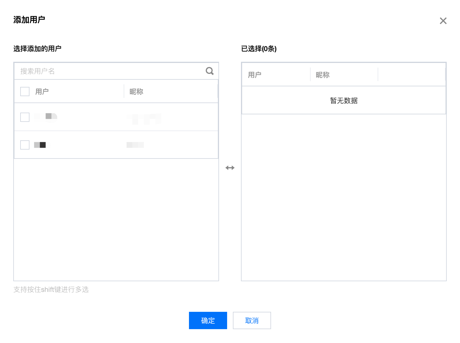- 在弹出的添加用户弹窗中,选择您想添加进该用户组的用户,然后单击【确定】。