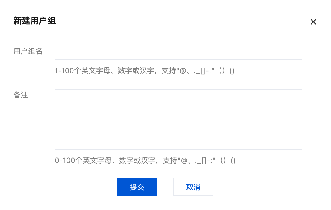 - 单击【新建用户组】,填写用户组名和备注,单击【提交】即可创建成功。