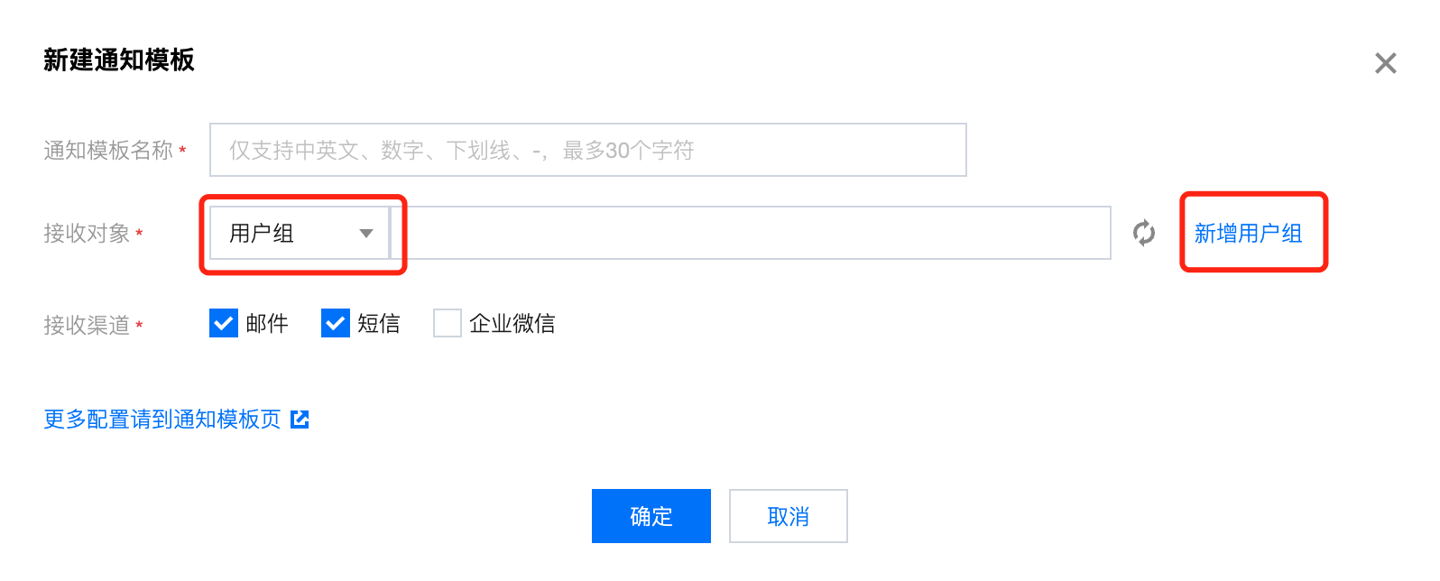 - 在弹出的新建通知模板弹框中,接收对象选择用户组时,单击【新增用户组】跳转至访问管理控制台配置用户组。