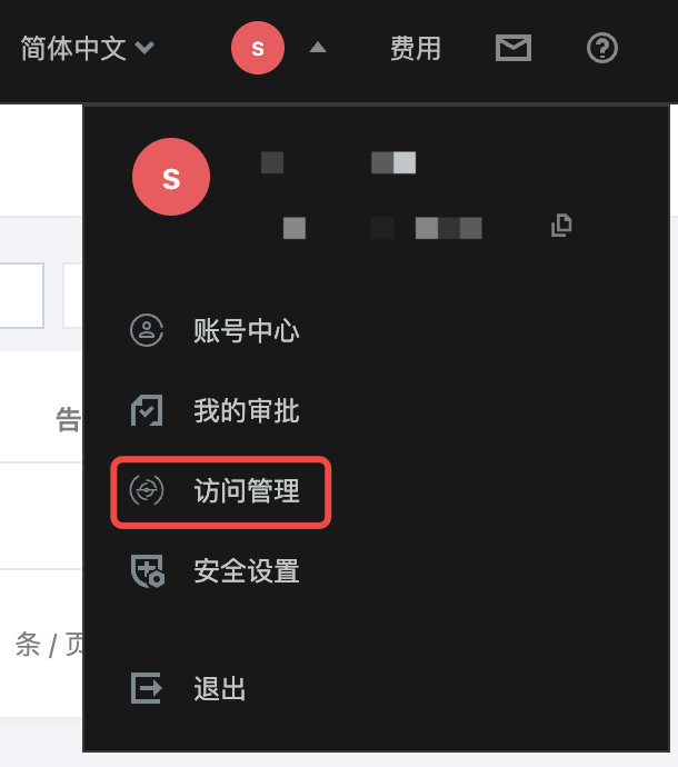 - 登录云平台控制台,将鼠标移入您的账号头像,单击【访问管理】。