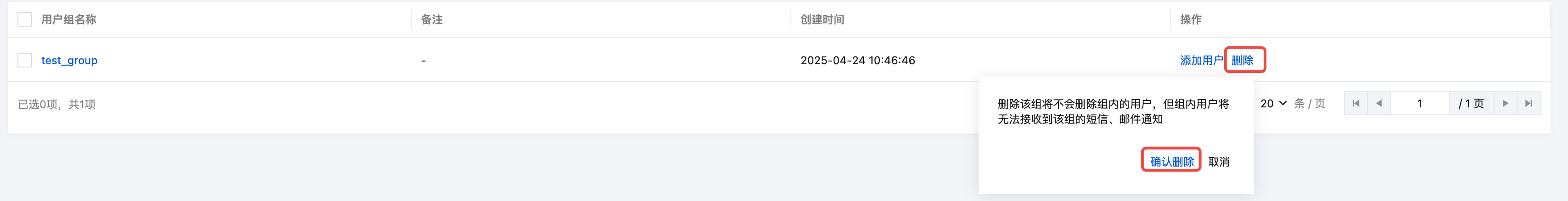 - 若您想删除用户组,在用户组列表中找到您想删除的用户组,单击右侧操作栏的【删除】,再点击【确认删除】。