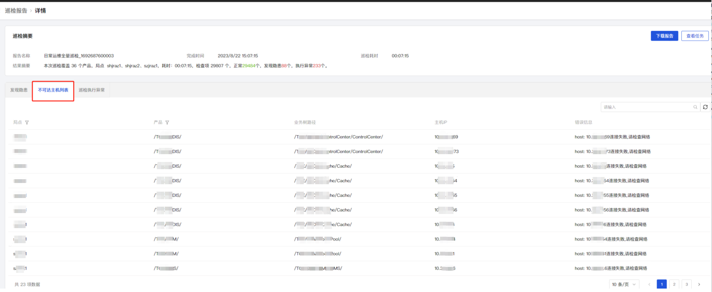 点击巡检报告详情页面的【不可达主机列表】,该列表展示当前巡检任务未连接成功的主机信息,根据列表中的错误信息提示解决,检查网络或免密配置信息等。