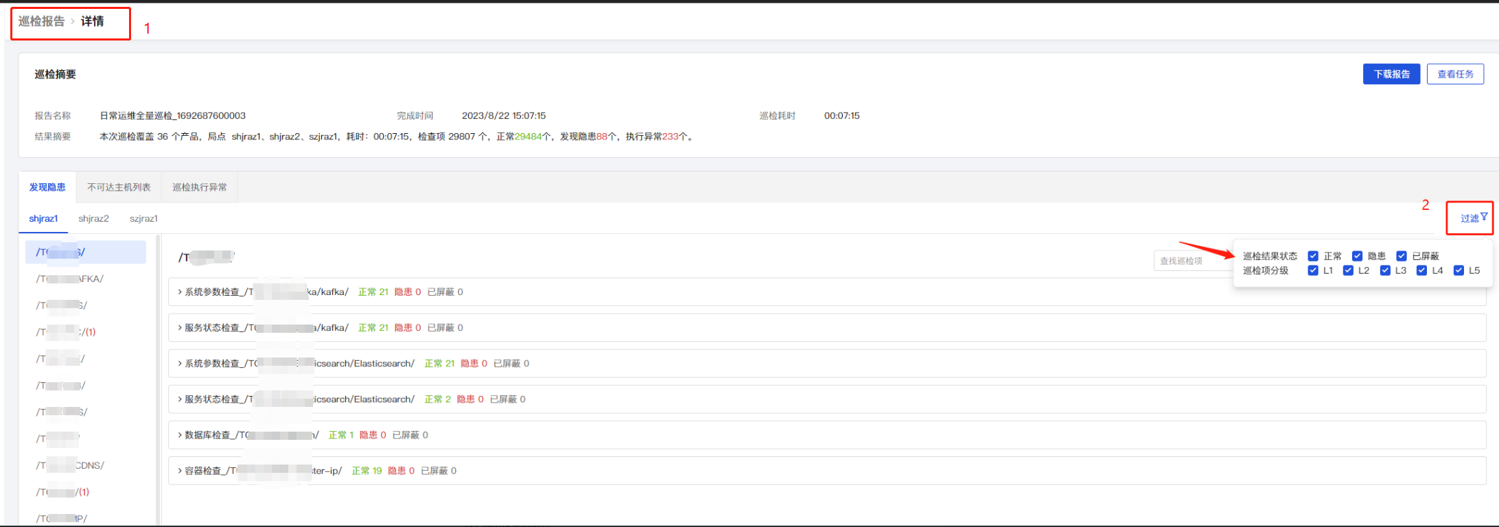 巡检报告详情页面可以通过勾选【巡检结果状态】和【巡检项分级】,按条件进行过滤。