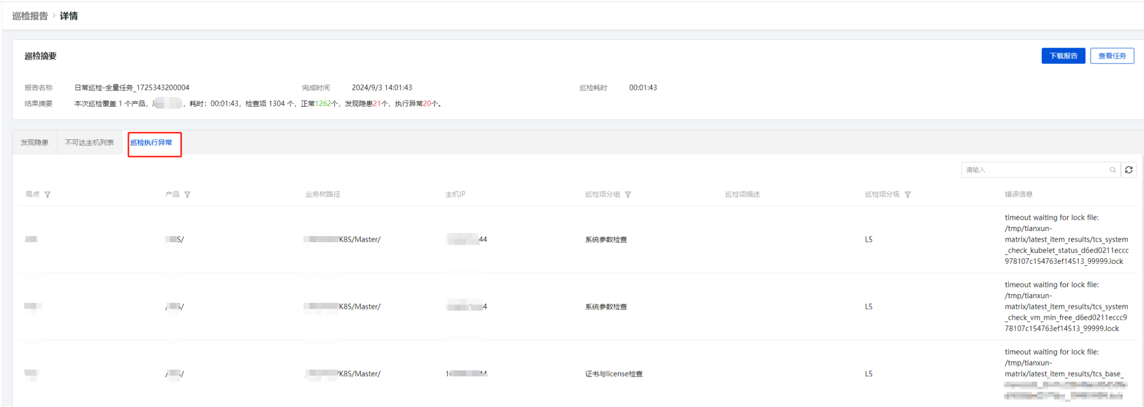 点击巡检报告列表中的【报告名称】进入该巡检报告详情页面,页面展示当前巡检摘要、发现隐患、不可达主机列表、巡检执行异常。