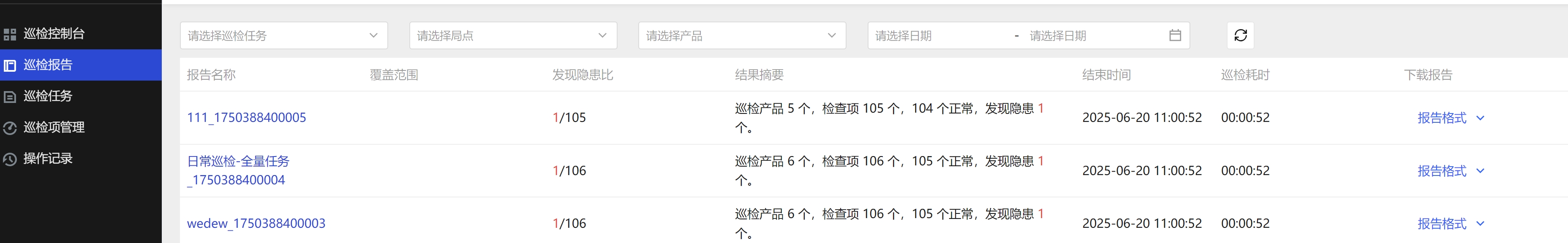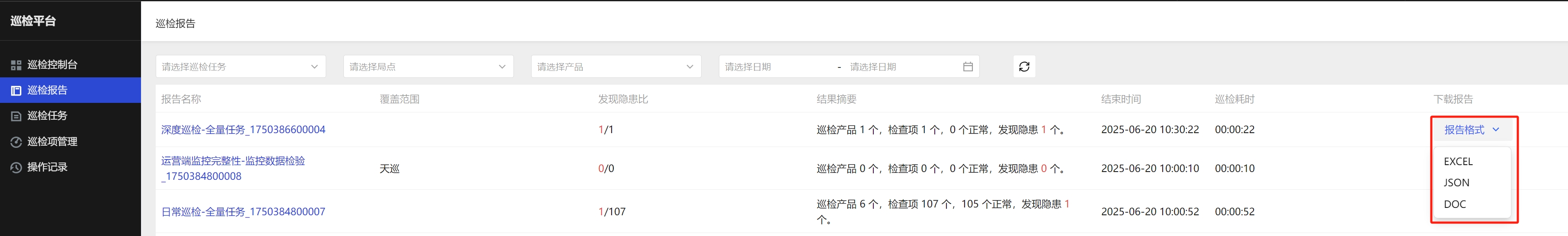 进入巡检报表页面,点击报告格式,即可下载相应格式的巡检报告。