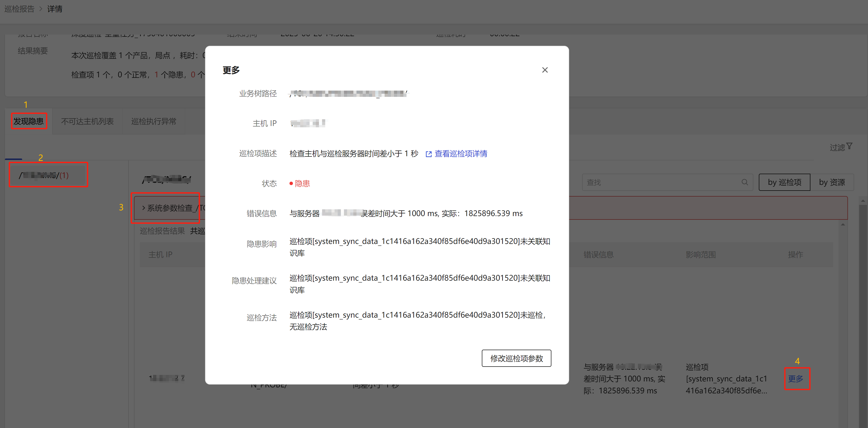 当前页面的产品名称后出现不为0的红色数量时,说明当前巡检任务发现被巡检产品存在隐患,可点击对应【产品】,展开红色的巡检组,点击异常状态巡检项的【更多】,可查看详细的巡检结果内容。
