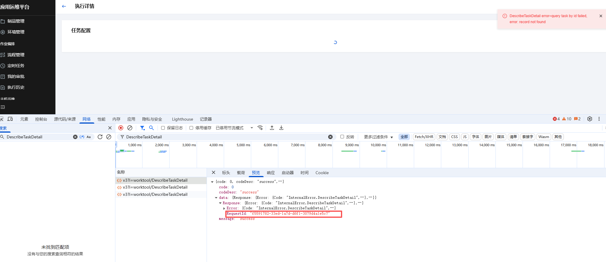 当发现前端页面报错时,请按 f12 打开浏览器的审查模式,可以看到上面这个例子是作业工具的任务详情页出现了报错。