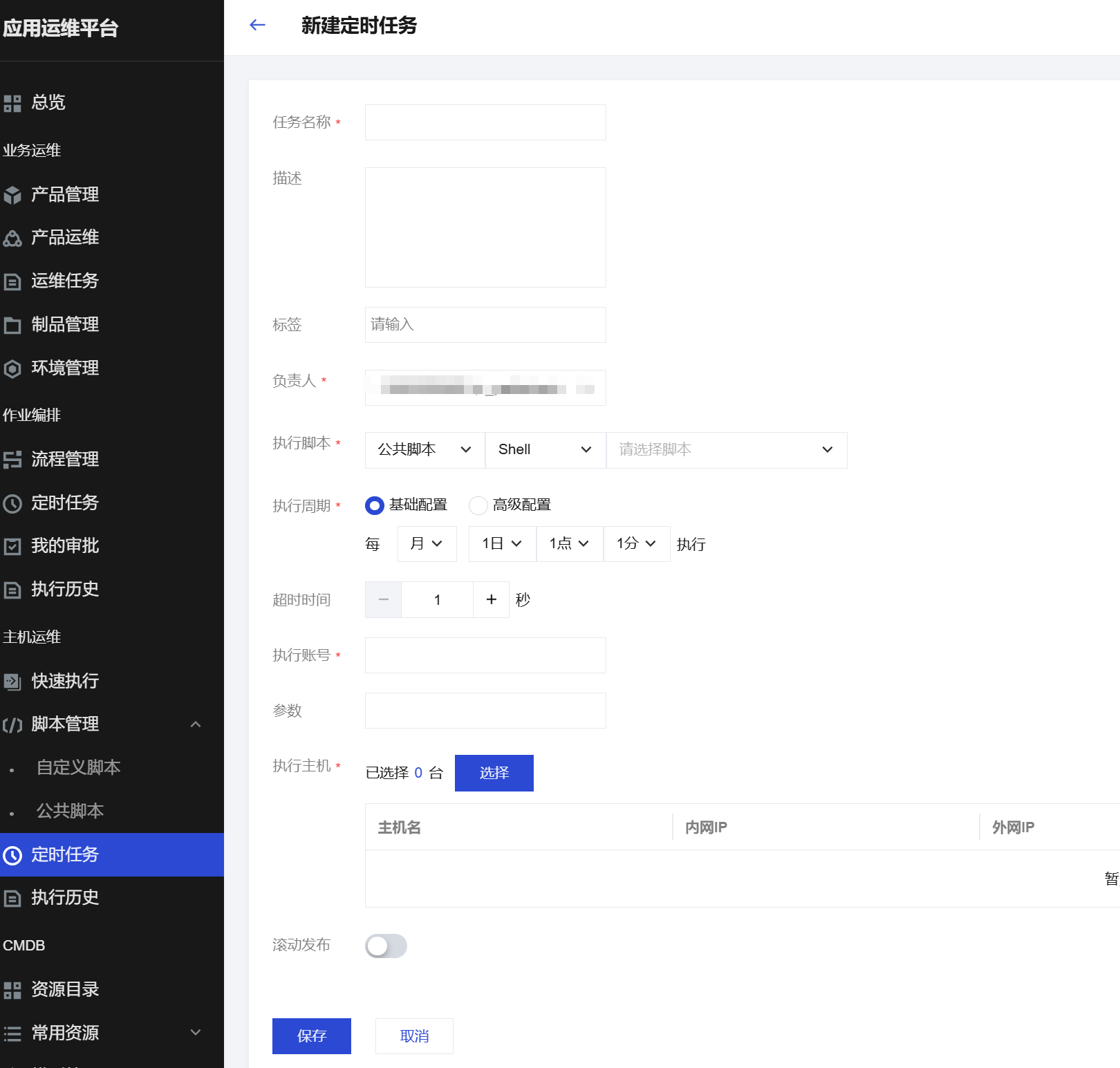 - 执行内容:脚本语言、来源、脚本内容、脚本参数、执行账号。