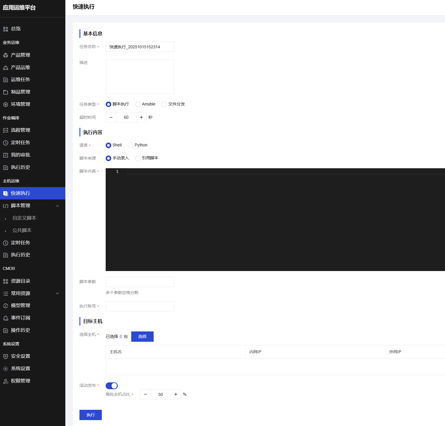 - 脚本类型:Shell、Python、Ansible Playbook。