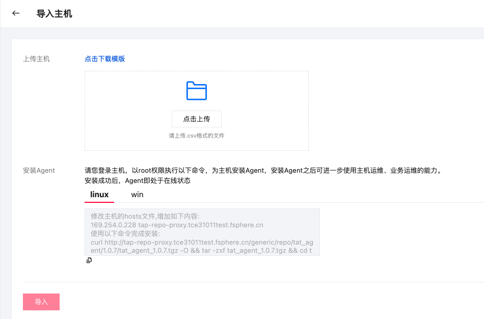 - 在导入主机页面,单击点击下载模板,获取文件后按格式要求填写主机信息,保存并上传至当前页面即可。